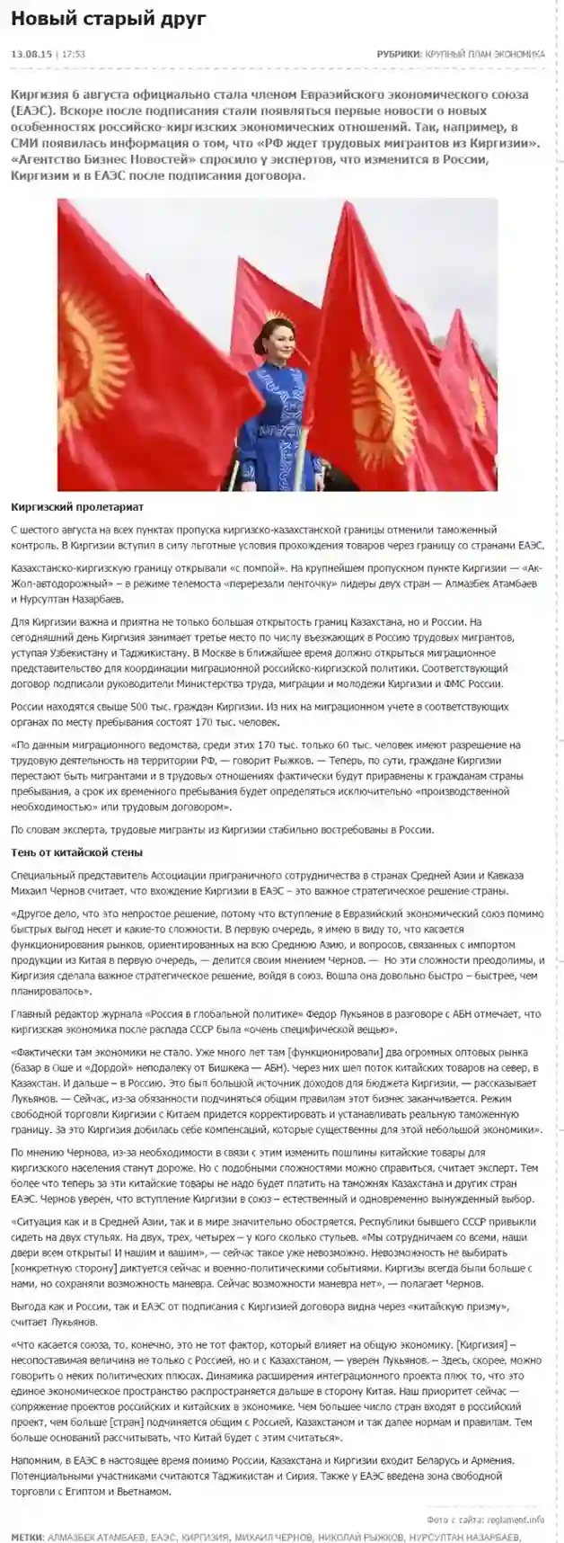 Киргизия 6 августа официально стала членом Евразийского экономического союза (ЕАЭС). Вскоре после подписания стали появляться первые новости о новых особенностях российско-киргизских экономических отношений. Так, например, в СМИ появилась информация о том, что «РФ ждет трудовых мигрантов из Киргизии». «Агентство Бизнес Новостей» спросило у экспертов, что изменится в России, Киргизии и в ЕАЭС после подписания договора.